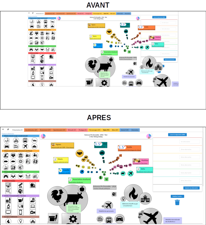 L’ensemble des alternatives sont possibles. Développé pendant le confinement de la crise covid, l’atelier a été construit de manière entièrement dématérialisé. Avec le temps et les demandes d’atelier en présentiel, nous avons amélioré l’atelier pour une expérience optimale en présentiel aussi bien qu’en distanciel. Bien que le format hybride soit possible, celle-ci est moins agréable et moins performative en mode hybride, c’est pourquoi nous privilégions le tout présentiel ou tout distanciel. (précision cela est valable pour une table de l’atelier mais nous pouvons avoir en même temps une table réalisé en présentiel et une table en distanciel)